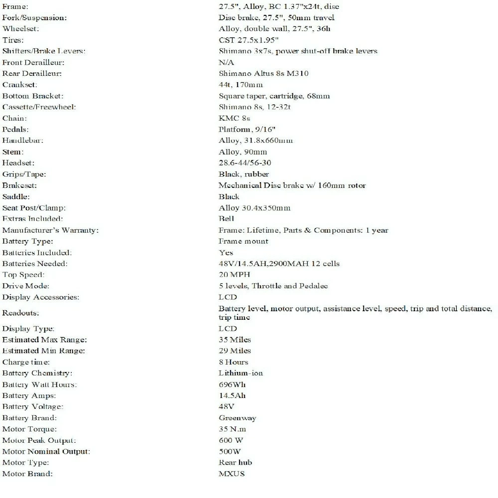 MOTOR/BATTERY: 500W Rear Hub Motor, a frame integrated 48-volt Lithium-Ion Greenway battery