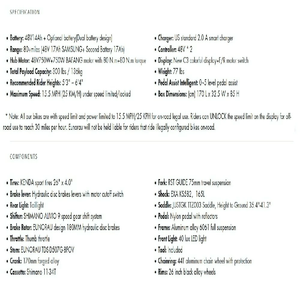 Eunorau Defender S 1500 Watt Dual Suspension/Dual Motor/Dual Battery E-bike Black 17”
