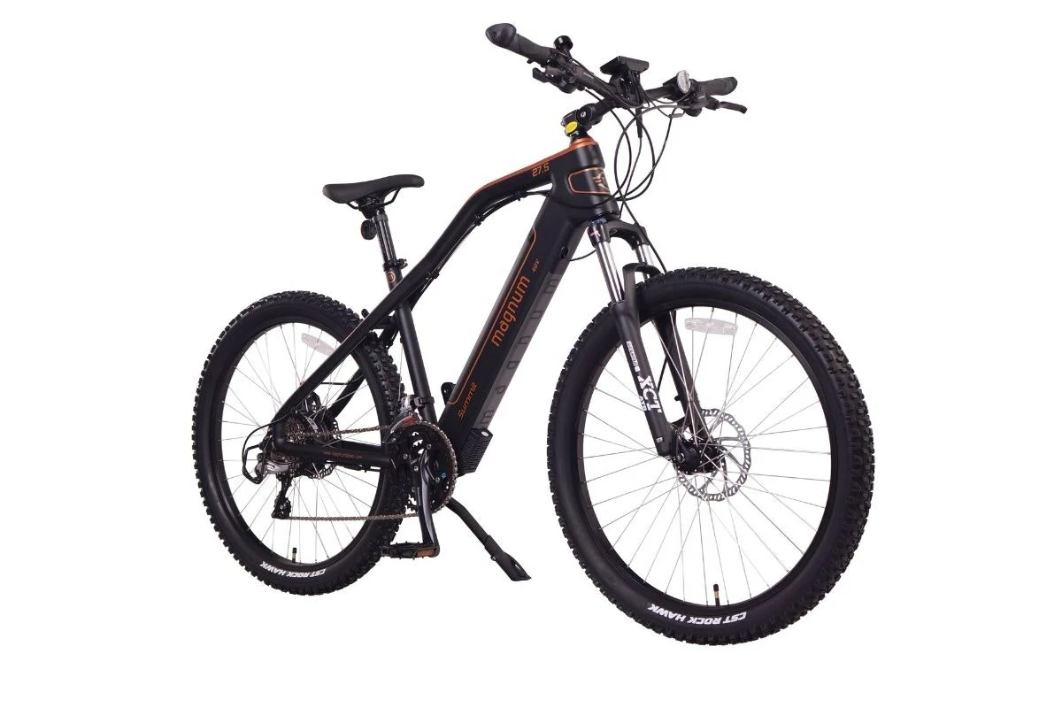 The Summit is the newest trail/mountain e-bike in the Magnum product line. It’s stand out features are the fully integrated battery for a sleek design and a range of accent colors span the top of the down tube. 48v, 500w power system with max speed of 25 MPH with pedal assist and 20 MPH throttle only. The sleek design and high-end components will turn heads.