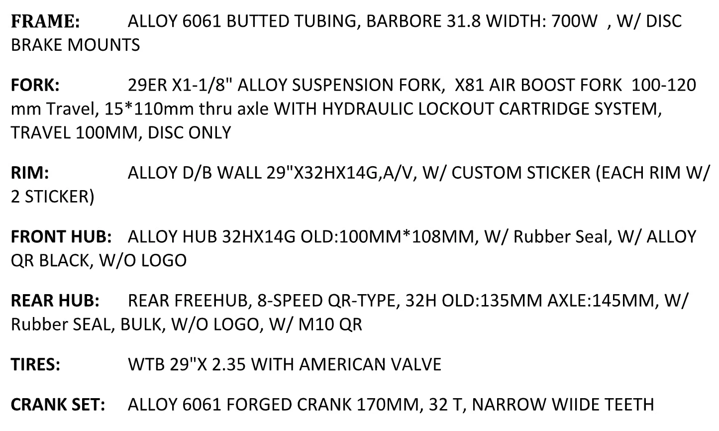 FORK: 29ER X1-1/8″ ALLOY SUSPENSION FORK, X81 AIR BOOST FORK 100-120 mm Travel, 15*110mm thru axle WITH HYDRAULIC LOCKOUT CARTRIDGE SYSTEM,TRAVEL 100MM, DISC ONLY
