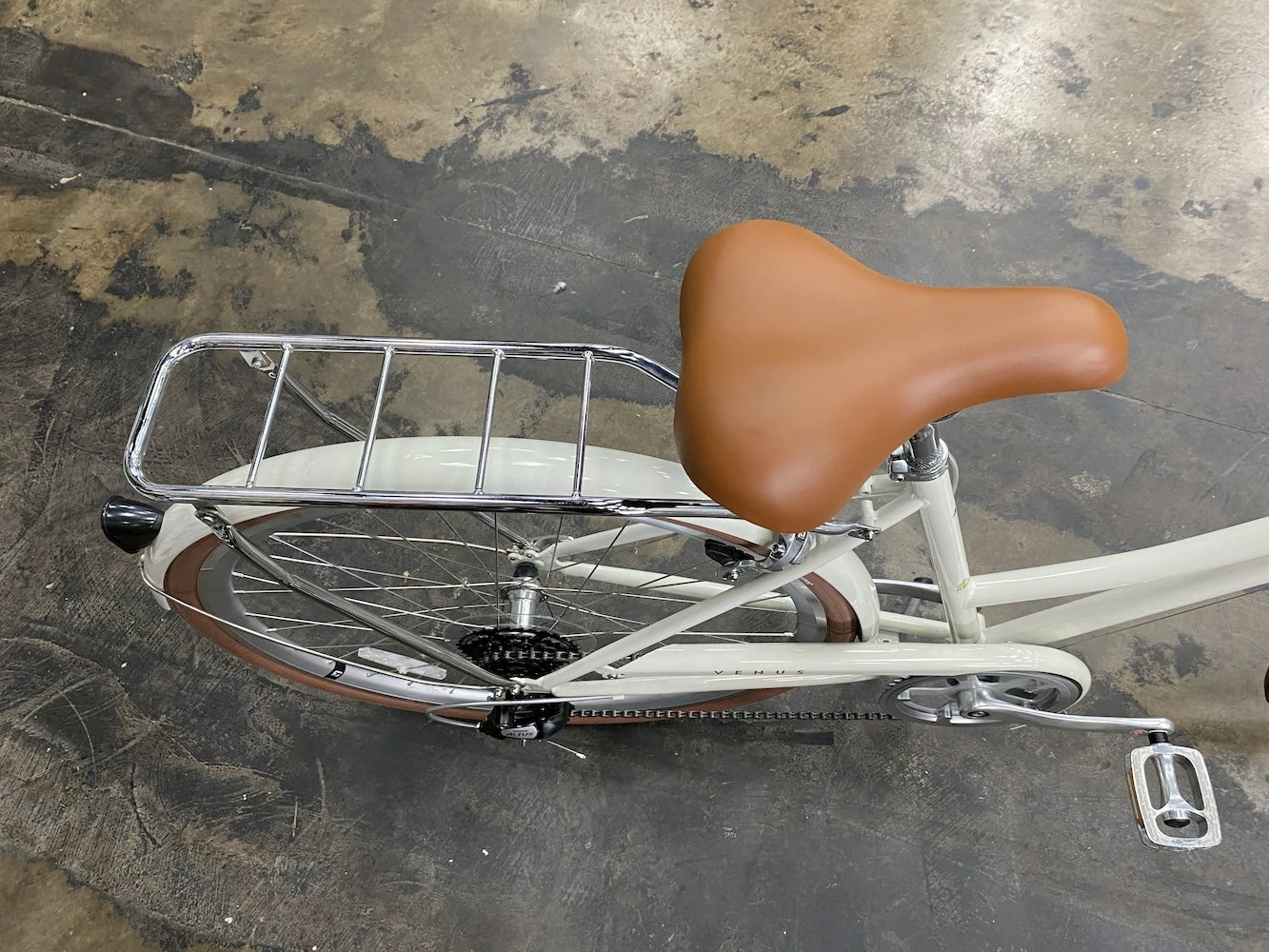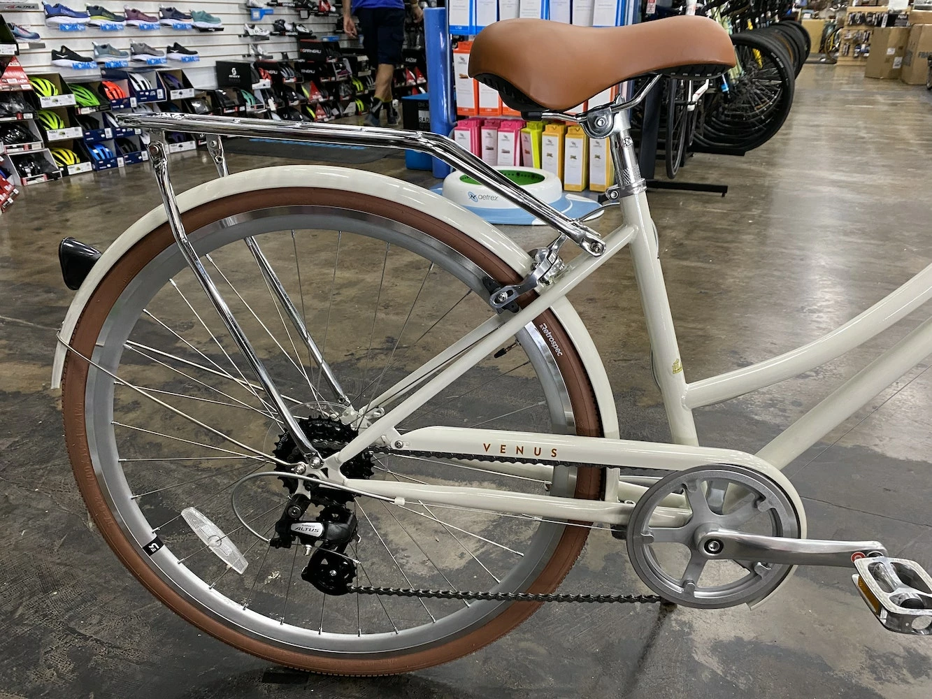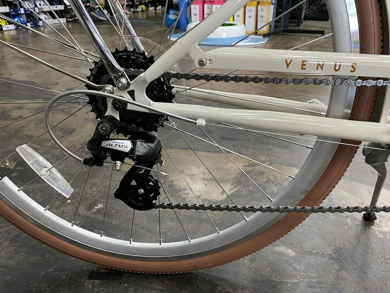 Venus is your ticket to elevated city cycling. Our leading 7-speed city bike pairs a classic silhouette with first-class components for an all-around dreamy ride. We hand build our bikes using high-tensile strength steel for a frame as durable as it is dazzling. Venus is a delightful blend of classic charm and modern componentry. A Shimano Rapid Fire 7-Speed shifter and Shimano Altus derailleur make switching gears a walk, or bike, in the park. Easily transition from hilly streets to flat city paths with a flick of the wrist. Venus’ 700x32C Kenda Commuter tires sport strategically placed water dispersal grooves for consistent grip and control as you ride, even in wet conditions. Sealed Cartridge Bearings keeps dirt and grime out of your bike and away from integral components, so your bike stays on the road longer.