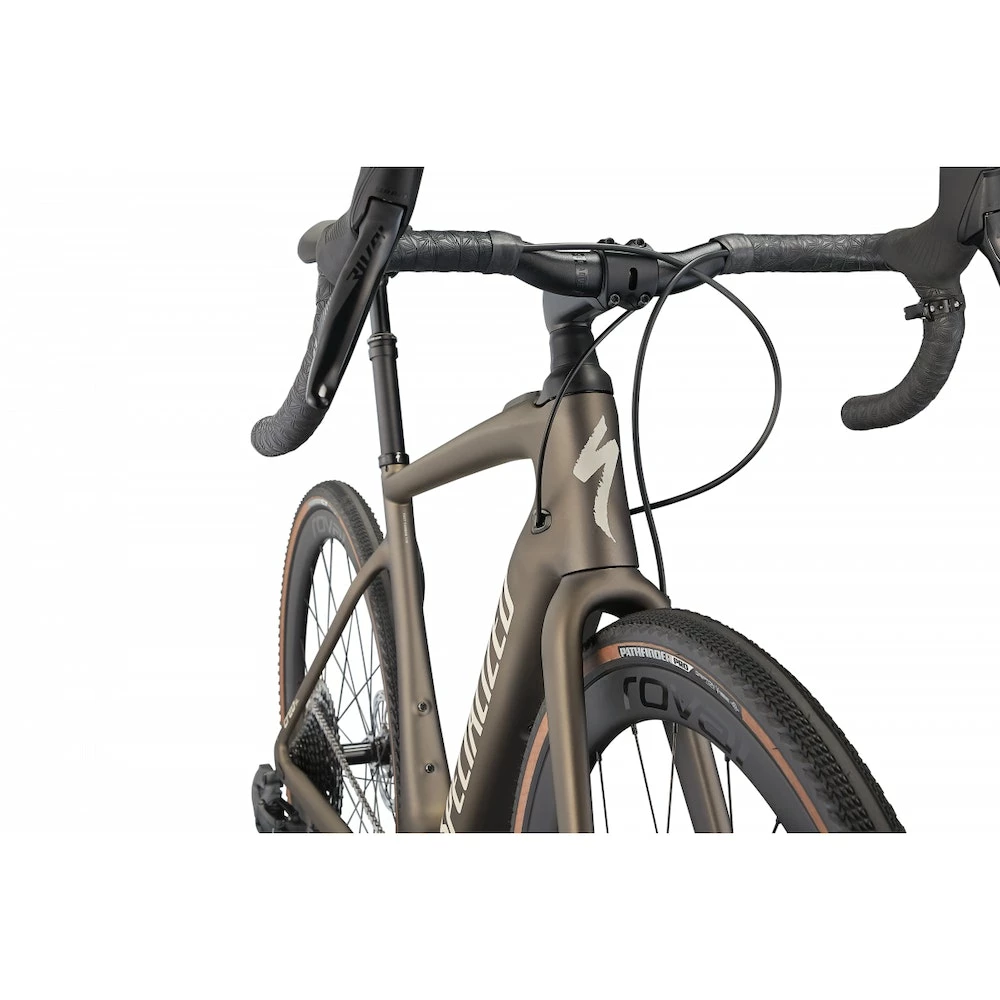 The Turbo Creo SL Expert EVO features out Fact 11r carbon chassis. Yes, that’s the same one on the S-Works model, and you’ll also get the new Future Shock 2.0. For the spec, we included a 1x SRAM Rival eTap AXS build and an 11-50t cassette to take on shifting and braking duties, while Roval C 38 Disc carbon wheels get wrapped in 38mm Pathfinder Pro 2Bliss Ready tires to keep you rolling worry-free and super fast, no matter the terrain. And filling out the build are our Adventure Gear bars with 12 degrees of flare, a Future Stem Pro, an X-Fusion 50mm Manic Dropper seatpost, and our fan-favorite Body Geometry Power Expert saddle.