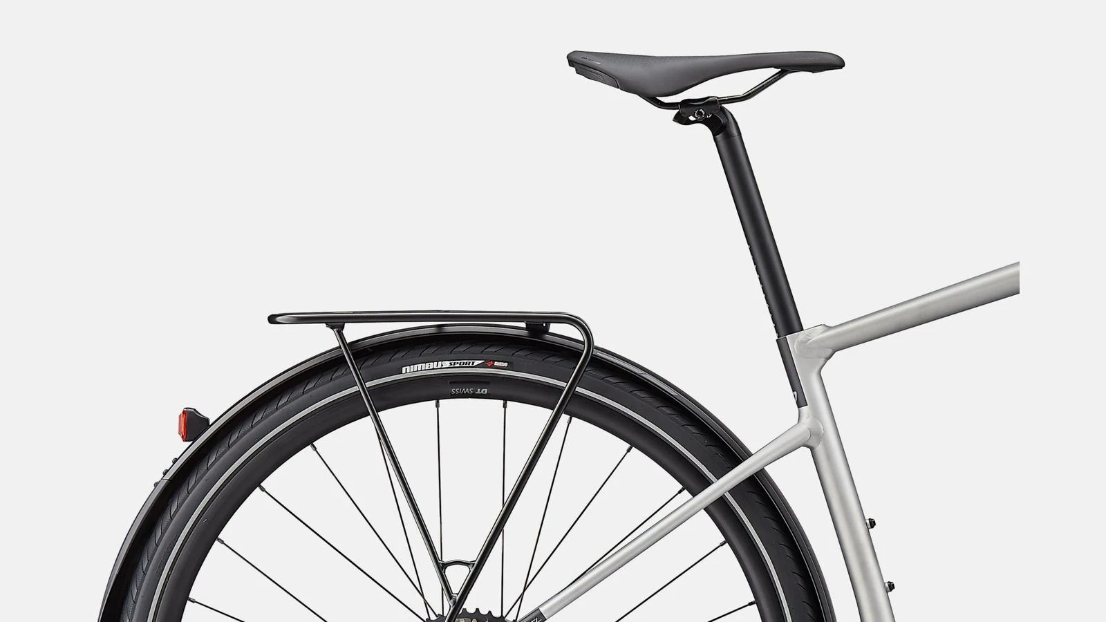 Turbo SL mounted rear rack, Racktime-compatible for your favorite bags and panniers, and DRYTECH fenders to keep the spray away.